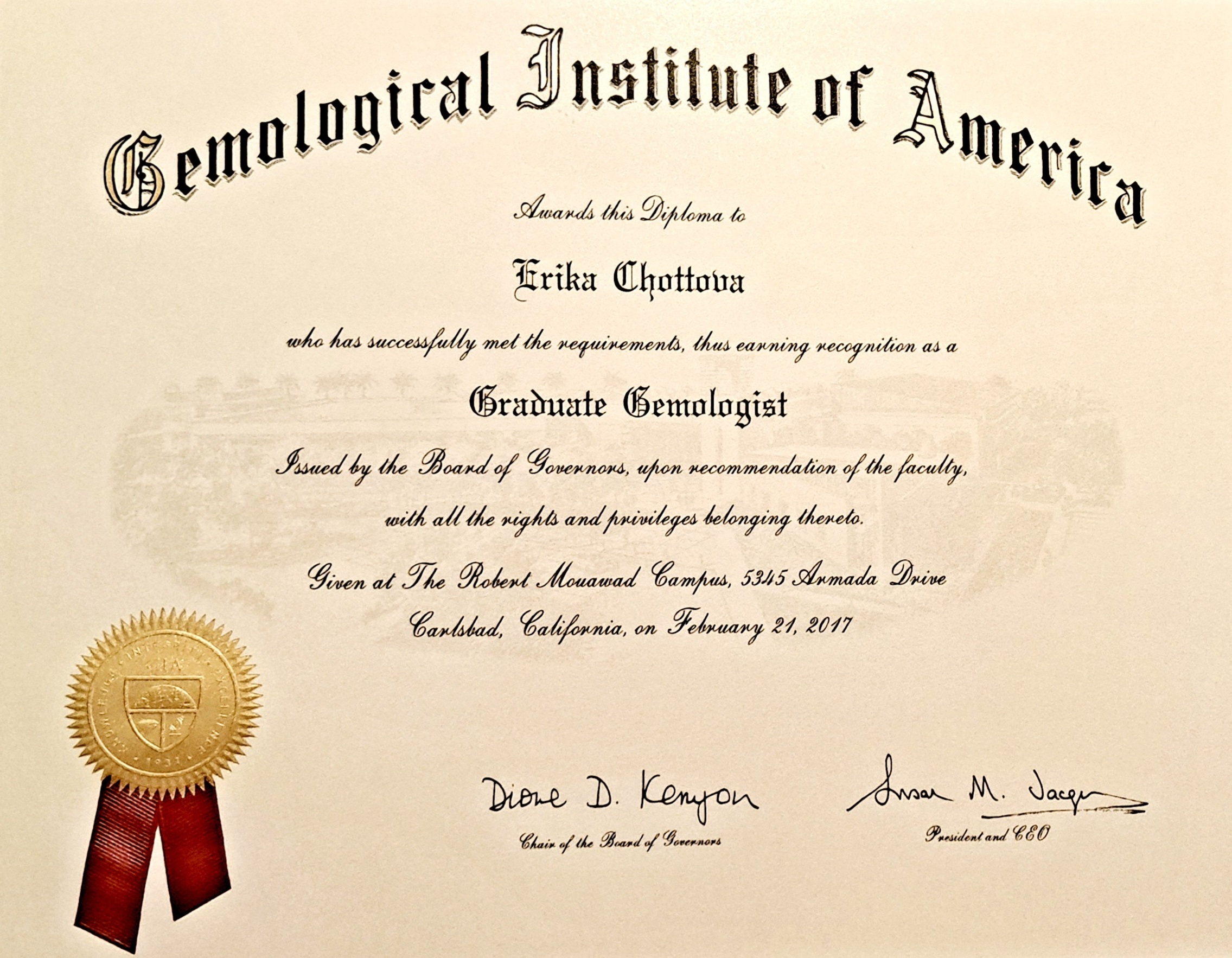 Ke každému drahokamu, perle, šperku je vystaven certifikát pravosti, gemoložkou GIA, paní Erikou Theodorou Chottovou.